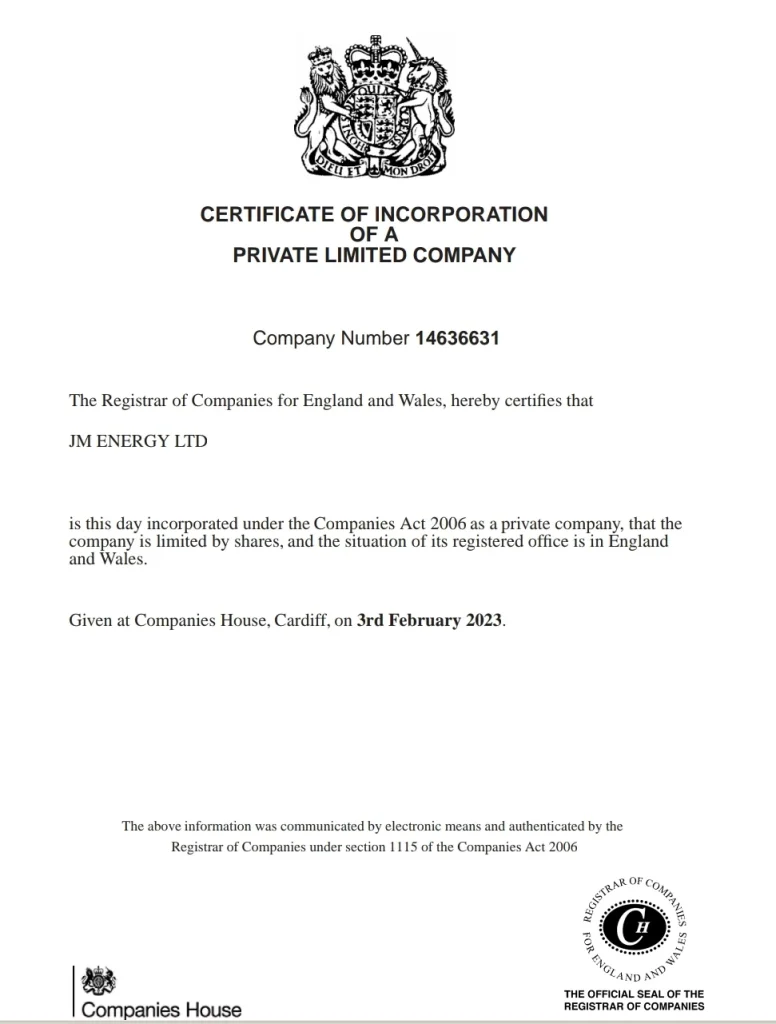 JM Energy is officially registered as a Private Limited Company.